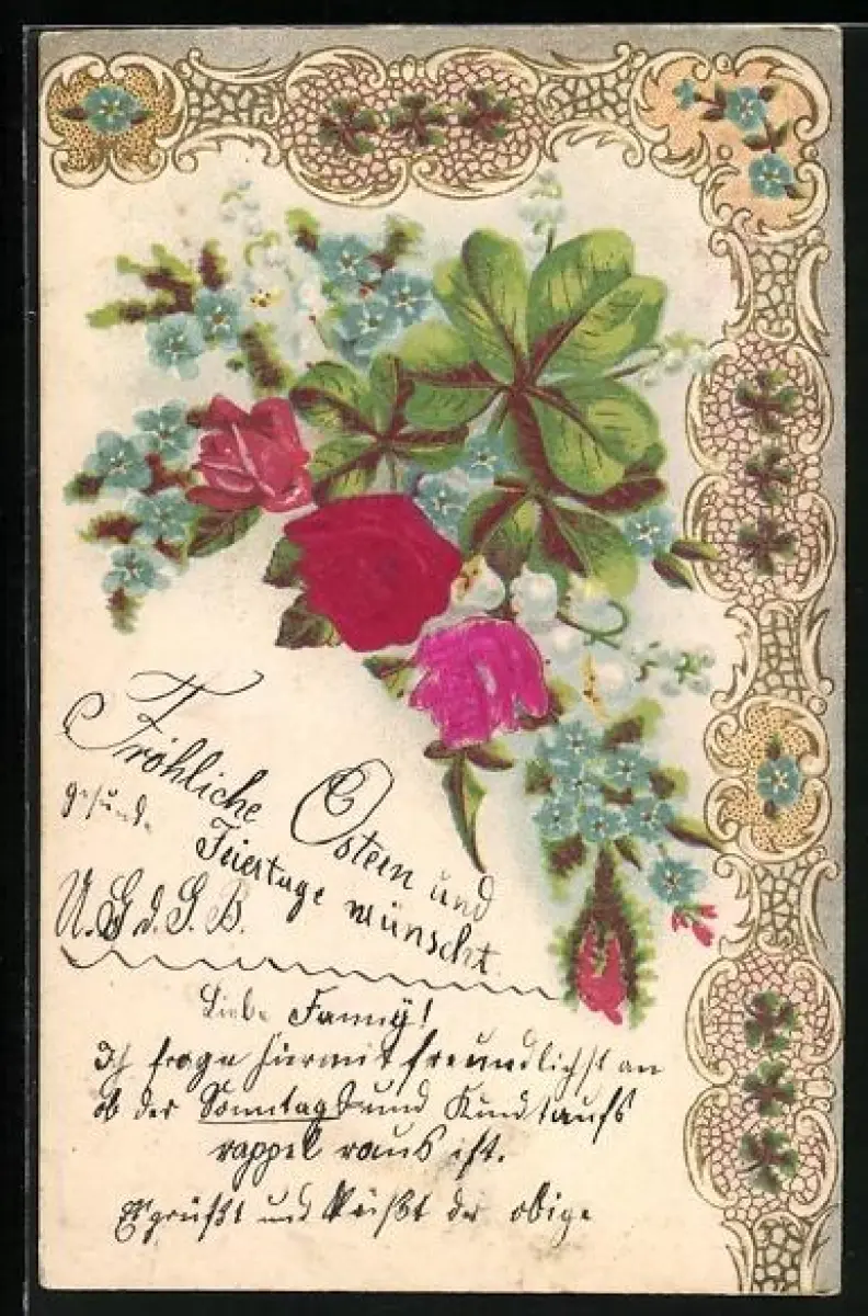 Stoff-Präge-AK Rosen, Klee und Vergissmeinnicht