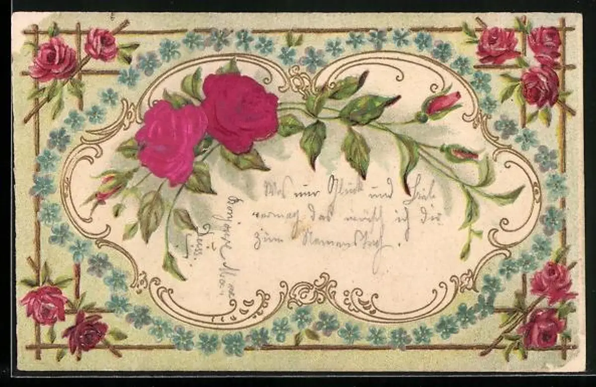 Stoff-Präge-AK Rosenzweig mit Vergissmeinnicht