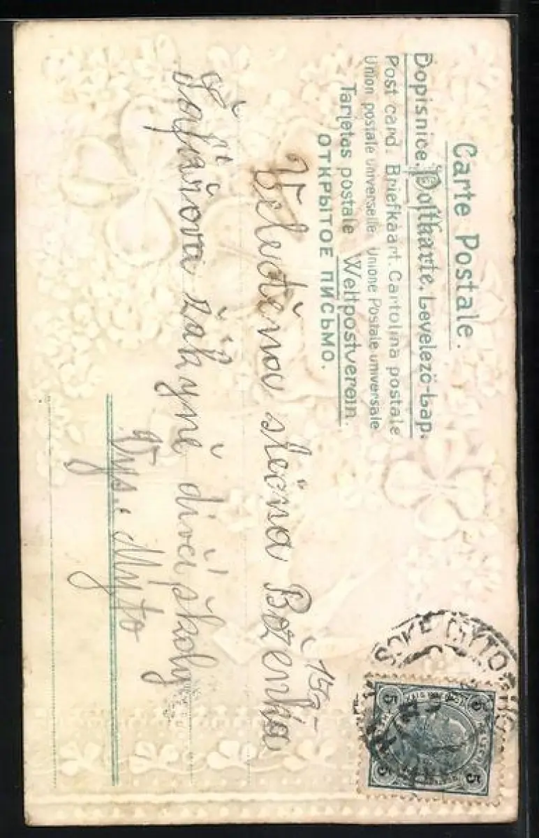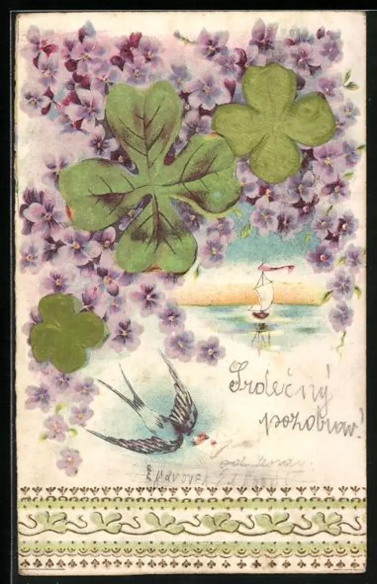 Stoff-Präge-AK Schwalbe mit Brief und Kleeblättern in Veilchen