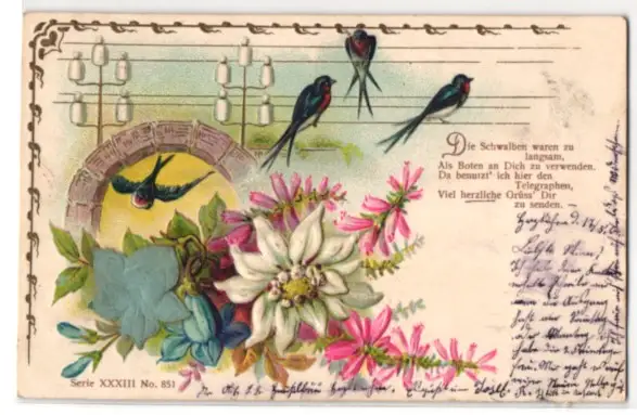 Stoff-Präge-AK Schwalben auf einer Telegrafenleitung und Enzian aus echtem Stoff