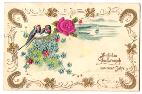 Stoff-Präge-AK Schwalben sitzen auf einem Blütenzweig, Rose aus echtem Stoff