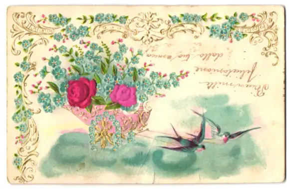 Stoff-Präge-AK Schwalben ziehen Wagen mit Blüten aus echtem Stoff