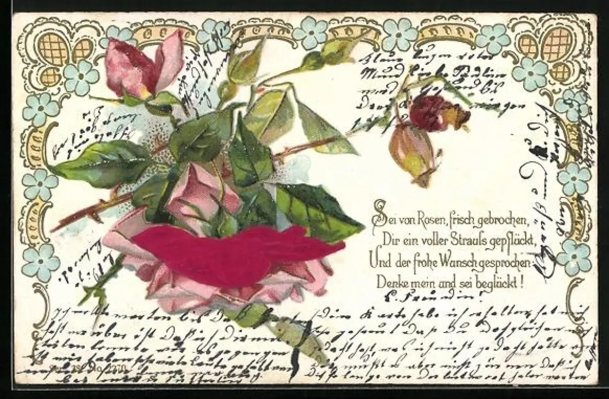 Stoff-Präge-AK Sei von Rosen, frisch gebrochen, Dir ein voller Strauss gepflückt...