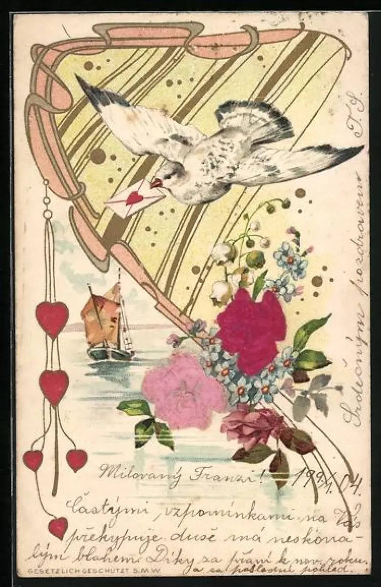 Stoff-Präge-AK Taube mit Liebesbrief und Rosen