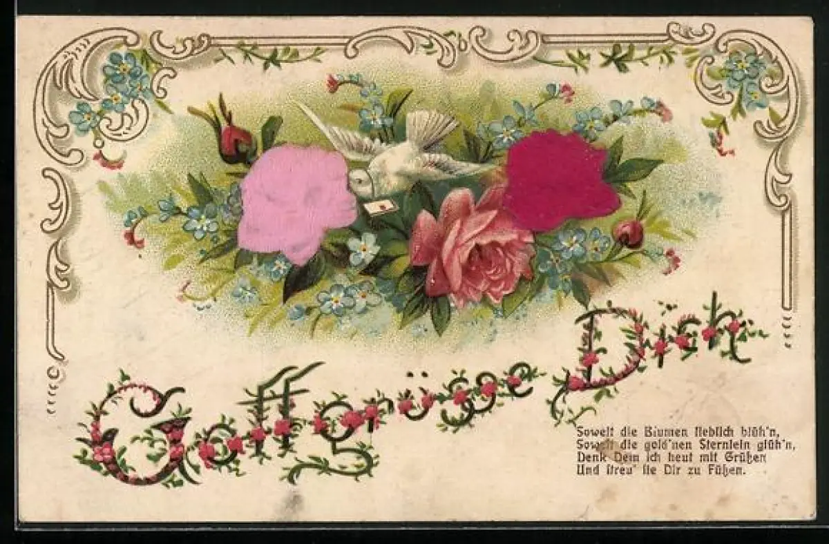 Stoff-Präge-AK Taube zwischen geprägten Rosen, Gott grüsse Dich
