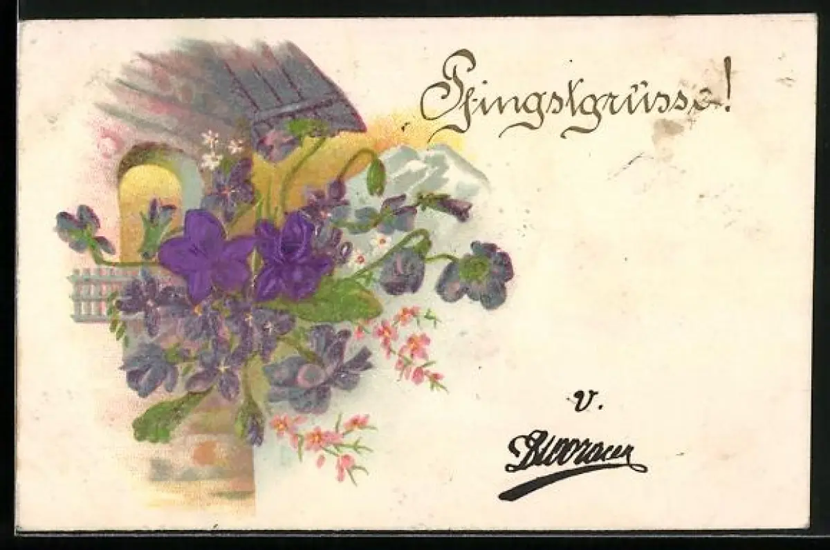 Stoff-Präge-AK Turm mit Veilchen, Pfingstgruss