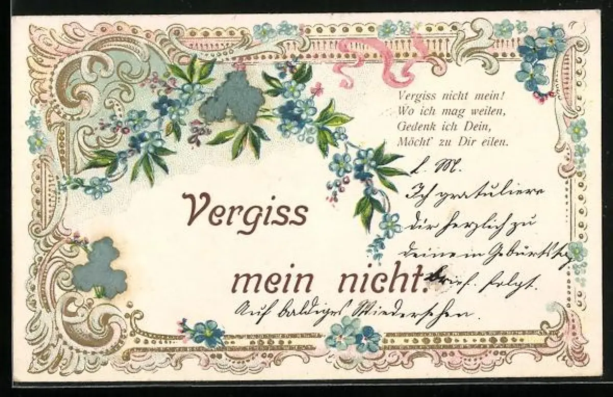 Stoff-Präge-AK Vergiss mein nicht, Vergiss nicht mein!, Wo ich mag weilen...
