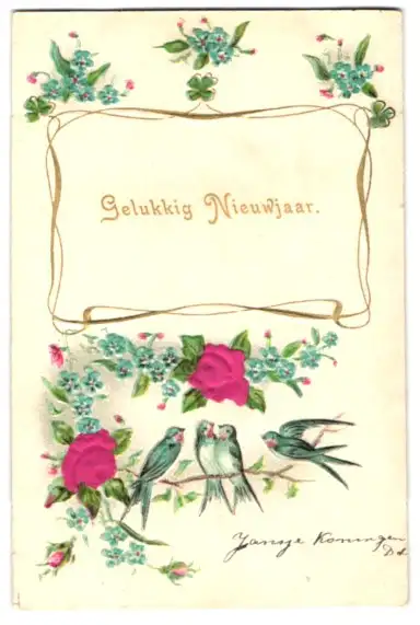 Stoff-Präge-AK Vergissmeinnicht, Rosenblüten, Vögel, Neujahrsgruss