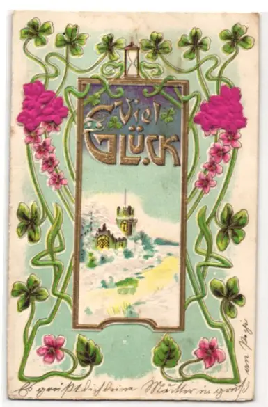 Stoff-Präge-AK Viel Glück, verschneite Kirche, Blumen aus echtem Stoff