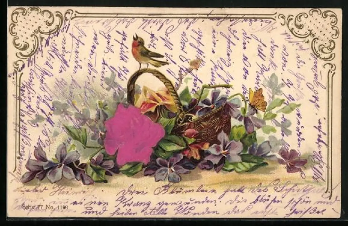 Stoff-Präge-AK Vogel auf einem Blumenkorb mit Schmetterling