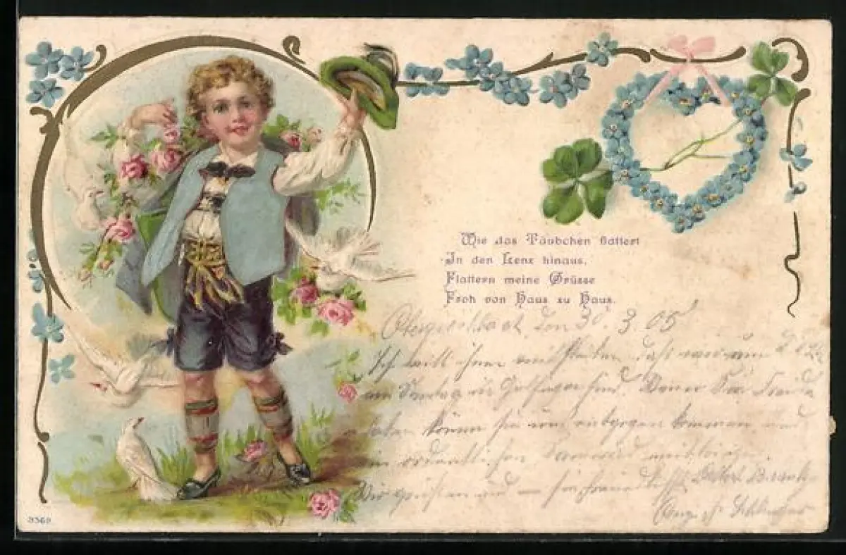Stoff-Präge-AK Wandernder Junge in Lederhose winkt mit dem Hut