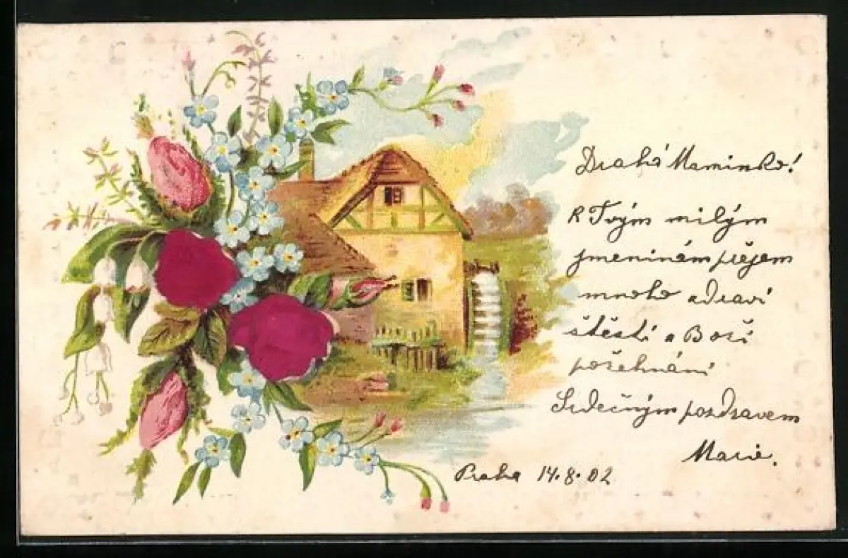 Stoff-Präge-AK Wassermühle mit Rosen u. Vergissmeinnicht, geprägtes Ornament