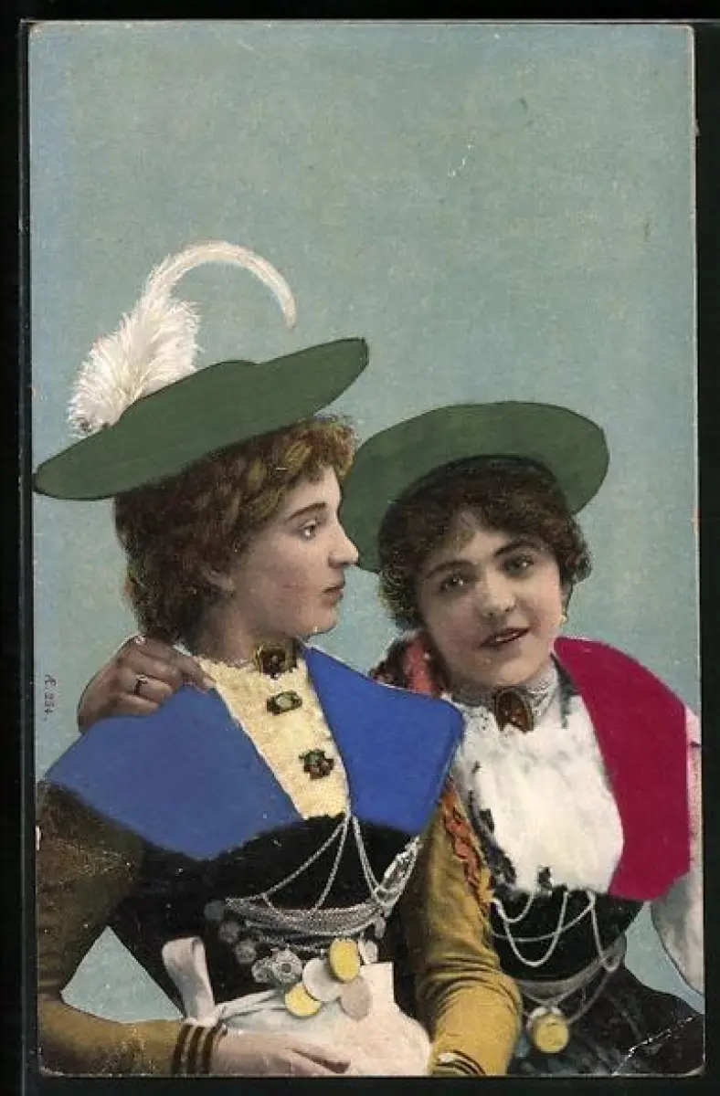 Stoff-Präge-AK Zwei Damen in traditioneller Kleidung