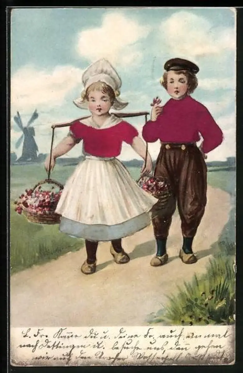 Stoff-Präge-AK Zwei Kinder mit Körben voller Blumen