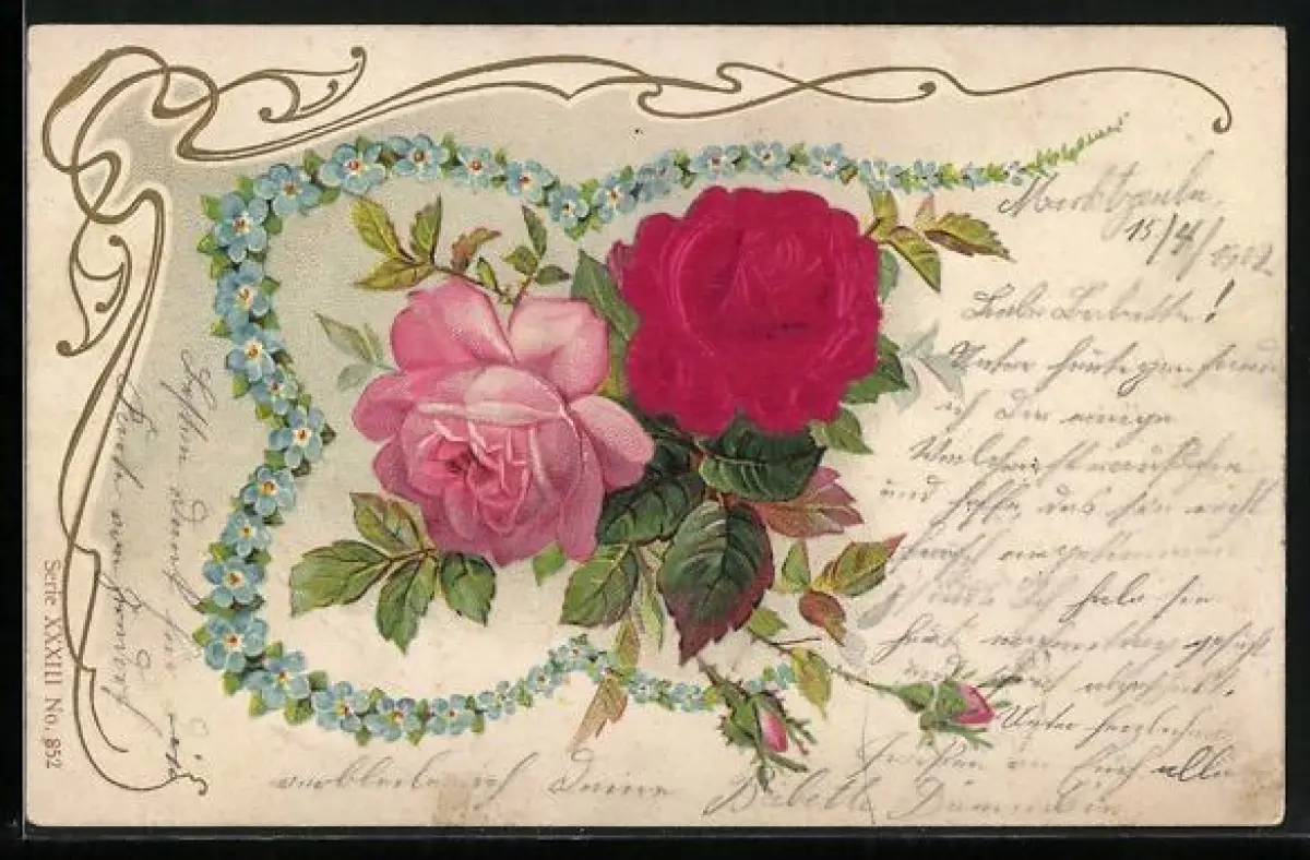Stoff-Präge-AK Zwei Rosen mit Vergissmeinnicht