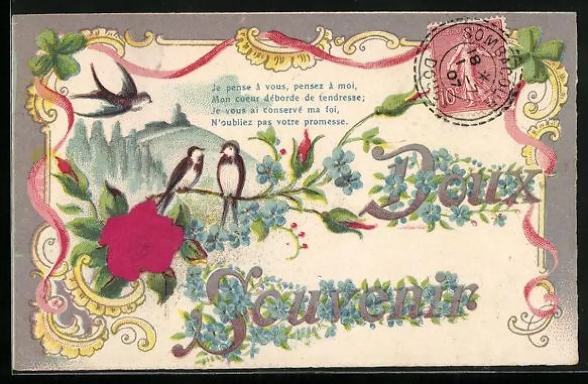 Stoff-Präge-AK Zwei Schwalben auf einem Rosenzweig mit Berglandschaft und Vergissmeinnicht, Doux Souvenir