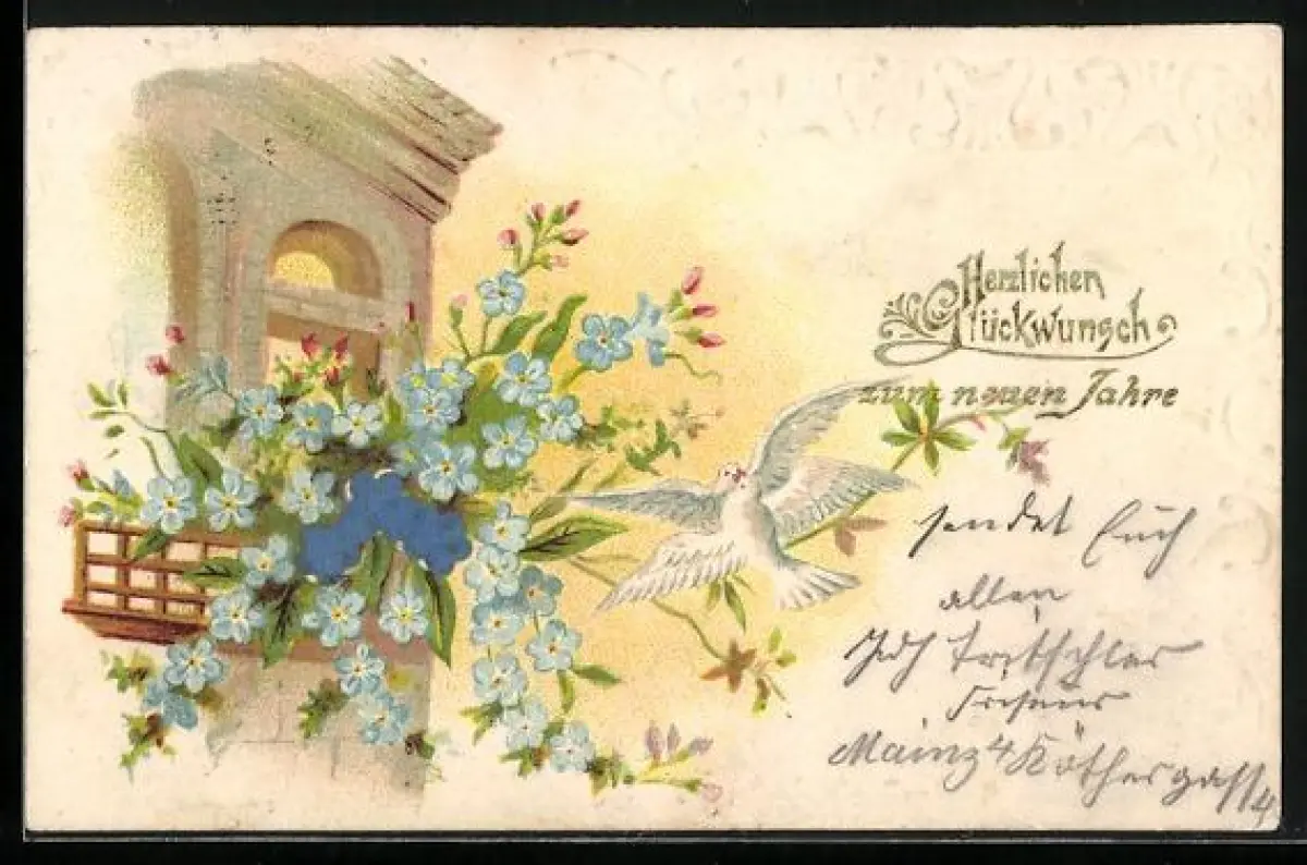 Stoff-Präge-AK Zwei Schwalben mit Vergissmeinnicht, Neujahr