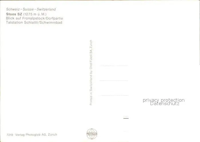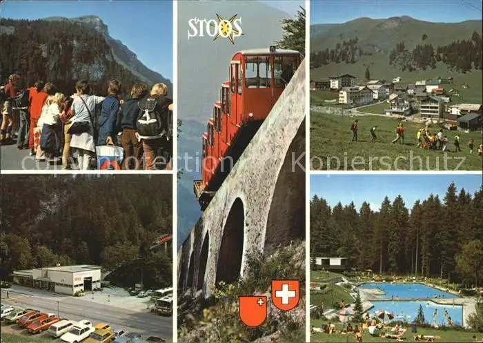 Stoos SZ Fronalpstock Dorfpartie Talstation Schlattli Bergbahn Schwimmbad Stoos postalisch nicht gelaufen nach 1965 Erhaltung siehe scans Alte Ansichtskarte Postkarte Frierer