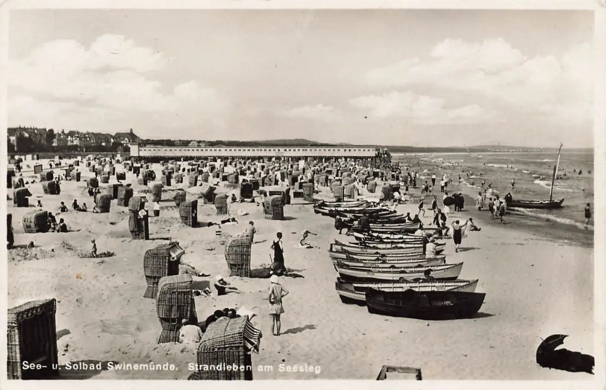 Strandleben am Seesteg Swinemünde Pommern Postkarte AK 1933