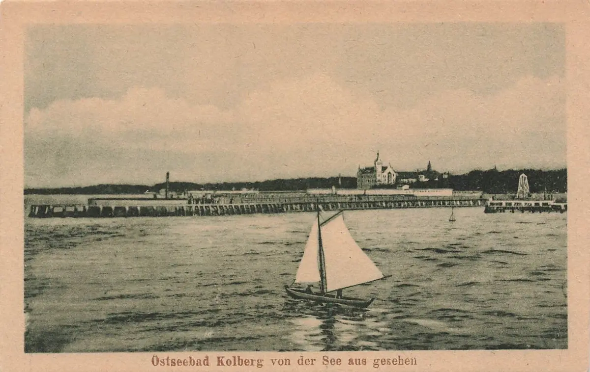 Strandschloss und Segelschiff von der See aus Kollberg Pommern Postkarte AK