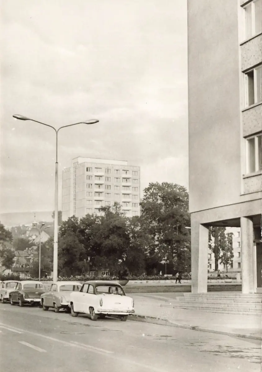 Straßenansicht mit Pkws Hochhaus in Suhl Thüringer Wald Thüringen Postkarte AK