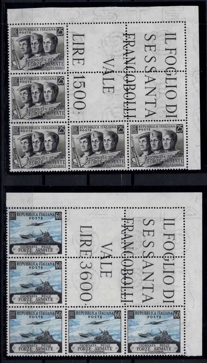 MNH - Vollgummi - Streitkräfte Lire 25 und 60 Nr. 700/701 die Eckblockserie von fünf Exemplaren (Eckblockkatalog Nr. 19/20) einwandfrei, gut zentriert mit Vollgummi - Ungewöhnlich in diesem Zustand - Kat. euro 200 Cod. 2753/WEB