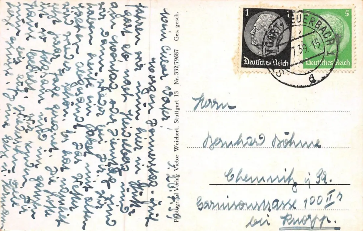 Rückseite: gelaufen 1939 von Stuttgart