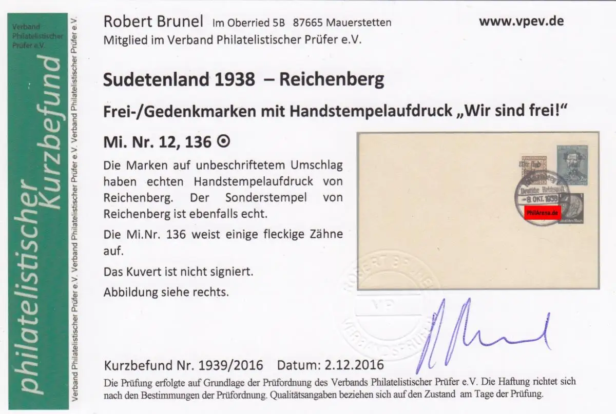 Sudetenland: MiNr. 12 und 136 auf Umschlag, Stempel Reichenberg