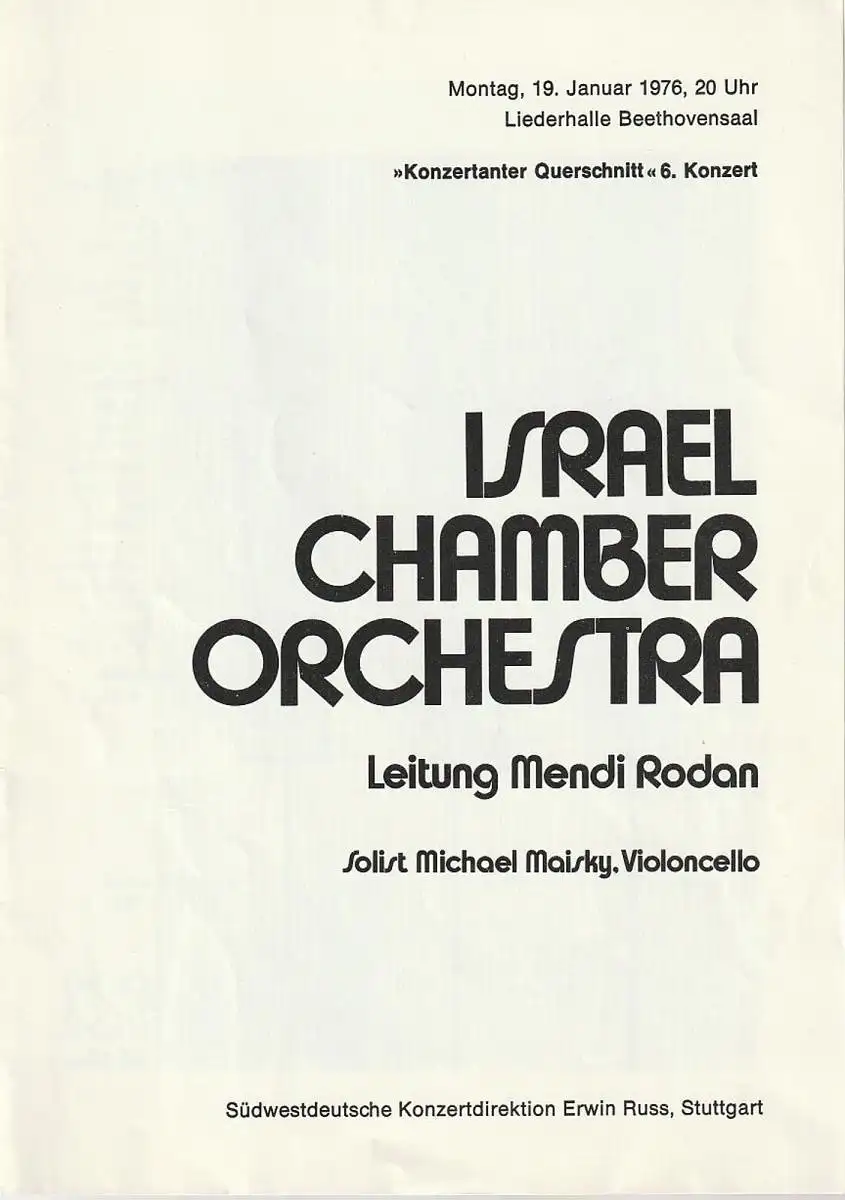 Südwestdeutsche Konzertdirektion Stuttgart, Erwin Russ: Programmheft KONZERTANTER QUERSCHNITT 6. KONZERT ISRAEL CHAMBER ORCHESTRA 19. Januar 1976 Liederhalle Beethovensaal.
