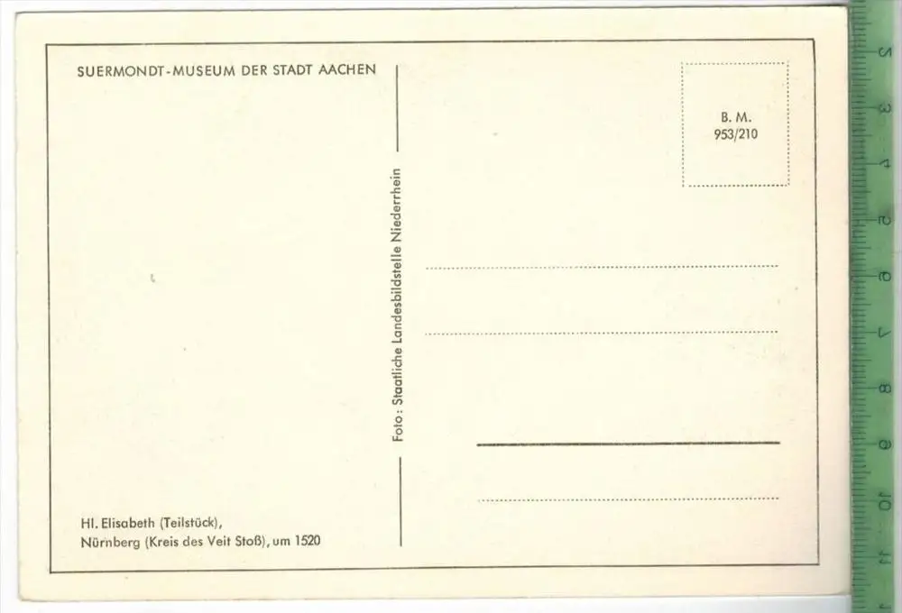 Suermondt-Museum der Stadt Aachen, Hl., Elisabeth (Teilstück), Nürnberg (Kreis des Veit Stoß), um 1520, Verlag: Staatl. Landesbildstelle Niederrhein, – Postkarte, unbenutzte Karte, Maße: 15 x10,5 cm, Erhaltung:I-II, Karte wird in Klarsichthülle verschickt.(H)