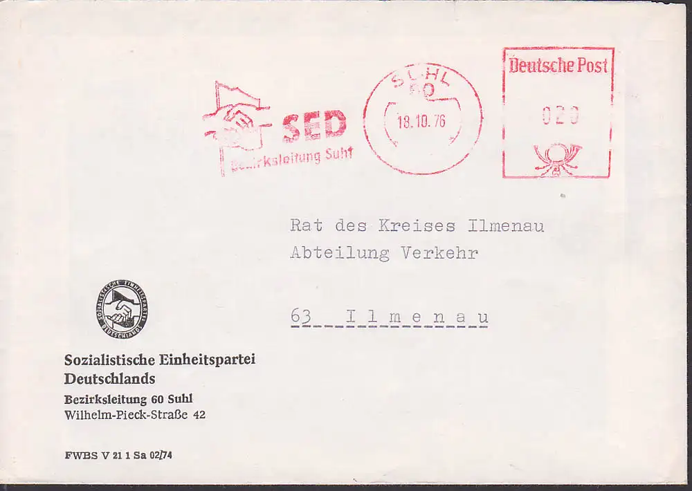 Suhl AFS 18.10.76 SED Bezirksleitung Suhl mit Parteilogo (dc30039)