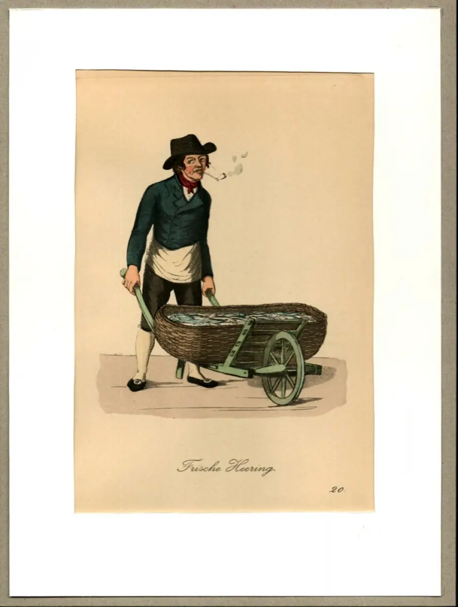 Suhr, Christopher: Frische Heering! [Kauft frische Heringe!]. Fischverkäufer | Fishmonger. Original-Lithographie, altkoloriert.