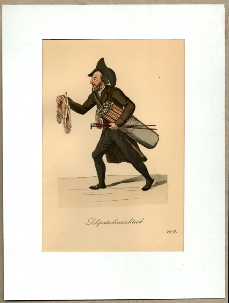 Suhr, Christopher: Schpatschierschstoeck! [Hier Spazierstöcke und Hosenträger zu kaufen!]. Accesoiresverkäufer | Cane & Braces Seller. Original-Lithographie, altkoloriert.