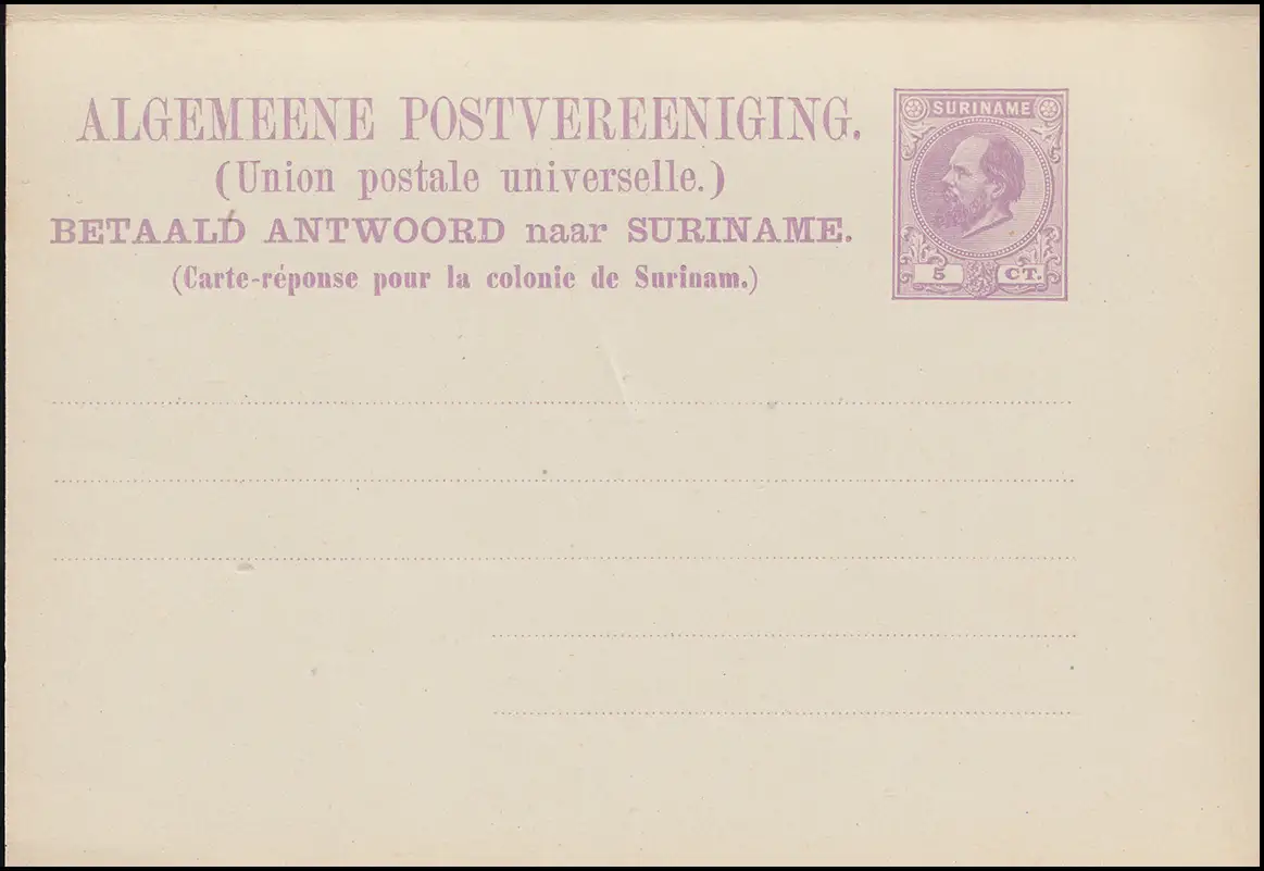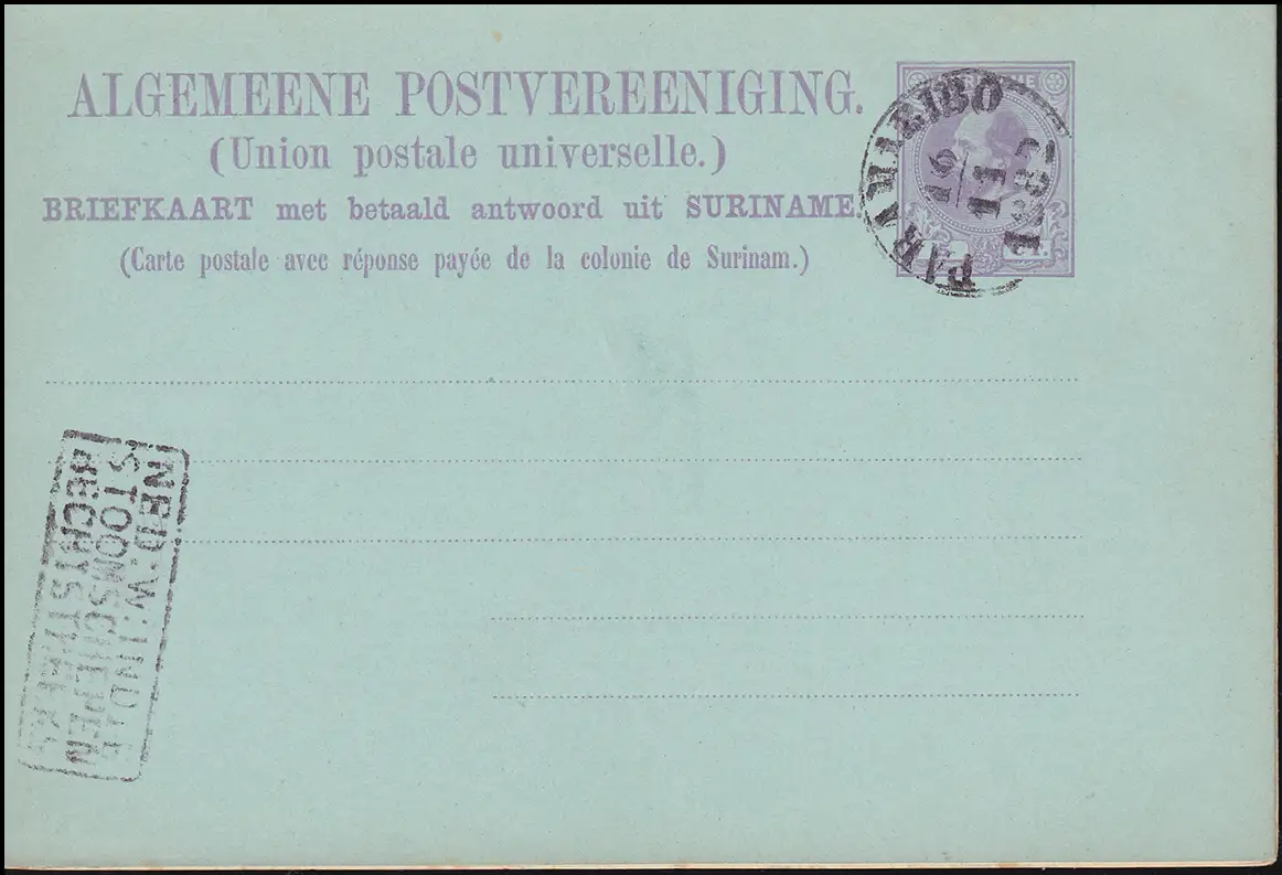 Surinam Doppel-Postkarte / Double Post Card 5/5 Ct. lila, PARAMARIBO 16.11.1882