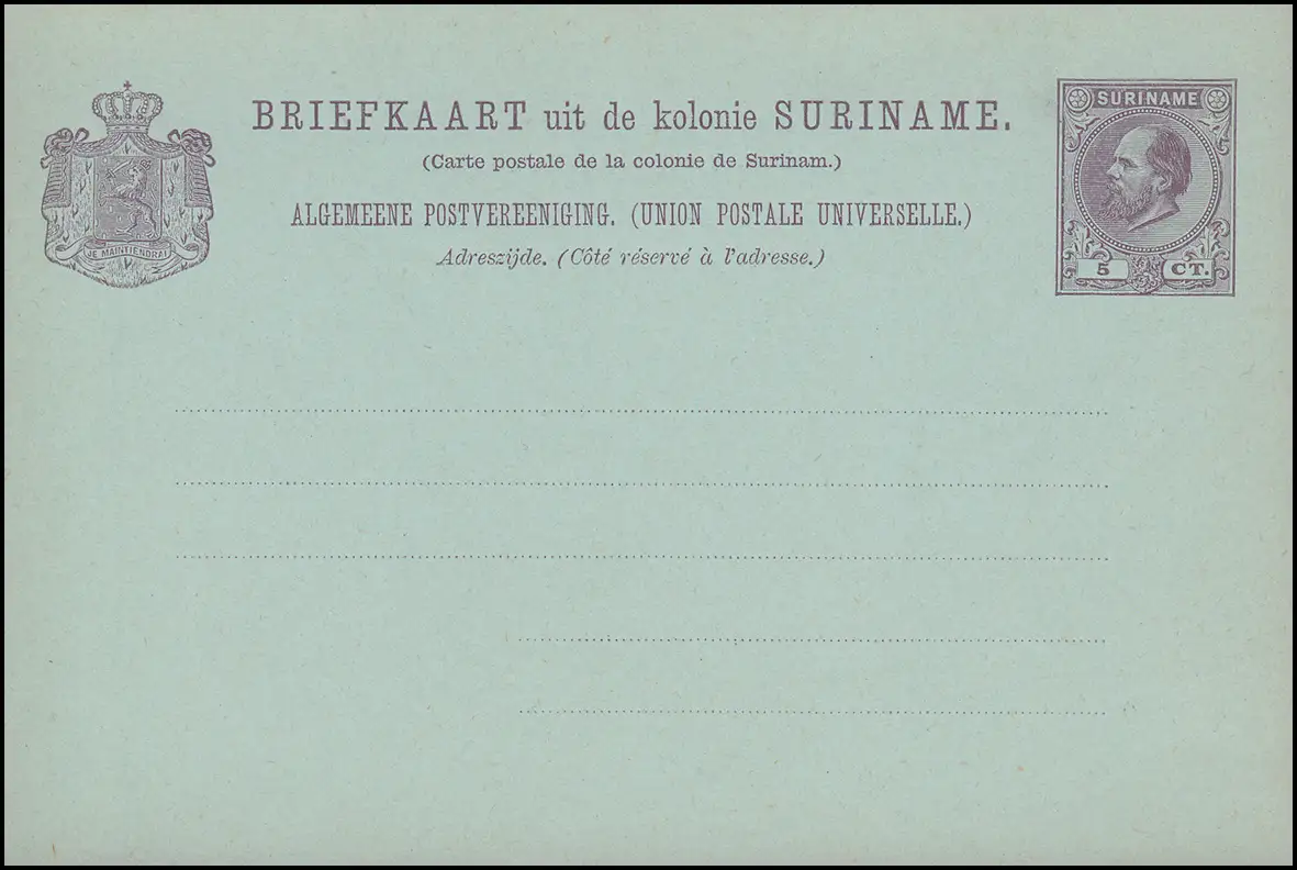 Surinam Postkarte / Post Card 5 Ct. lila auf bläulich 1888, ungebraucht **