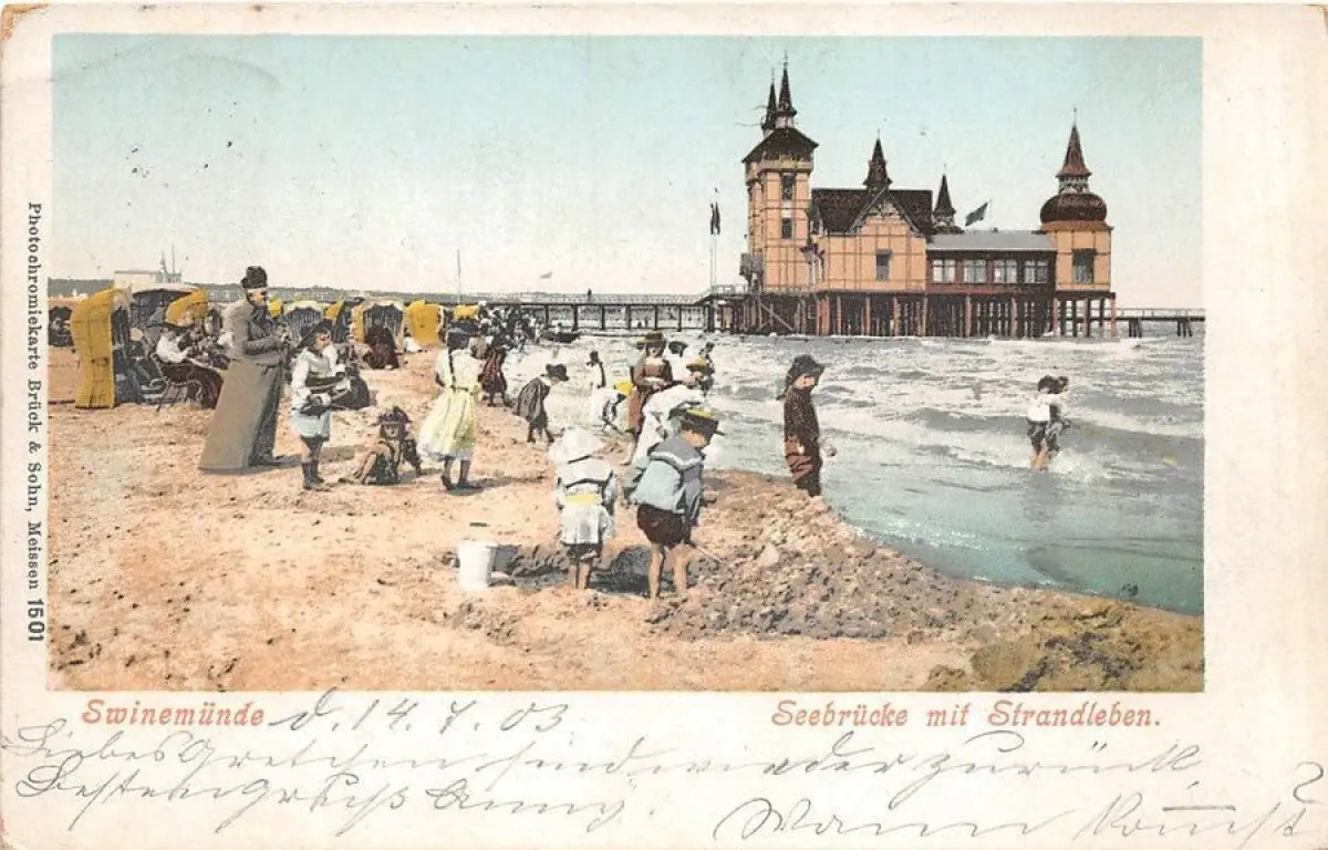 Swinwmünde / Świnoujście Westpommern Seebrücke mit Strandleben Kinder 1903