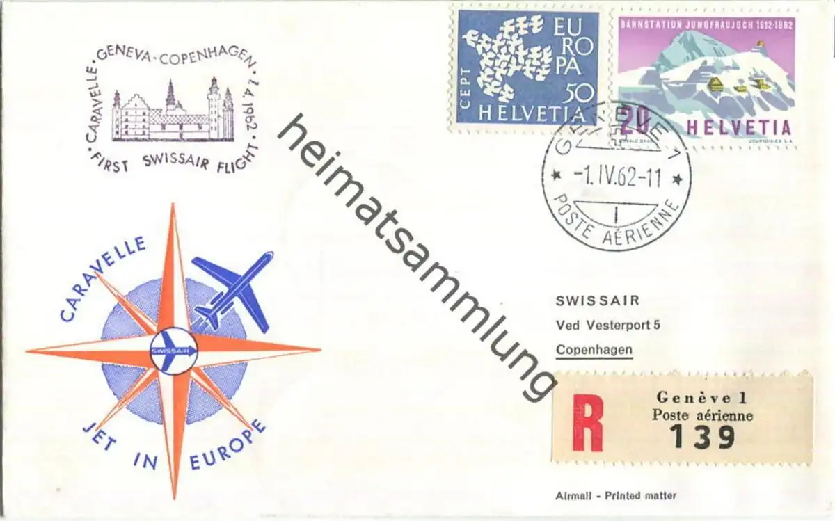 Swissair - First Jet Flight - Caravelle - Genf-Copenhagen 1962 - Prägedruck