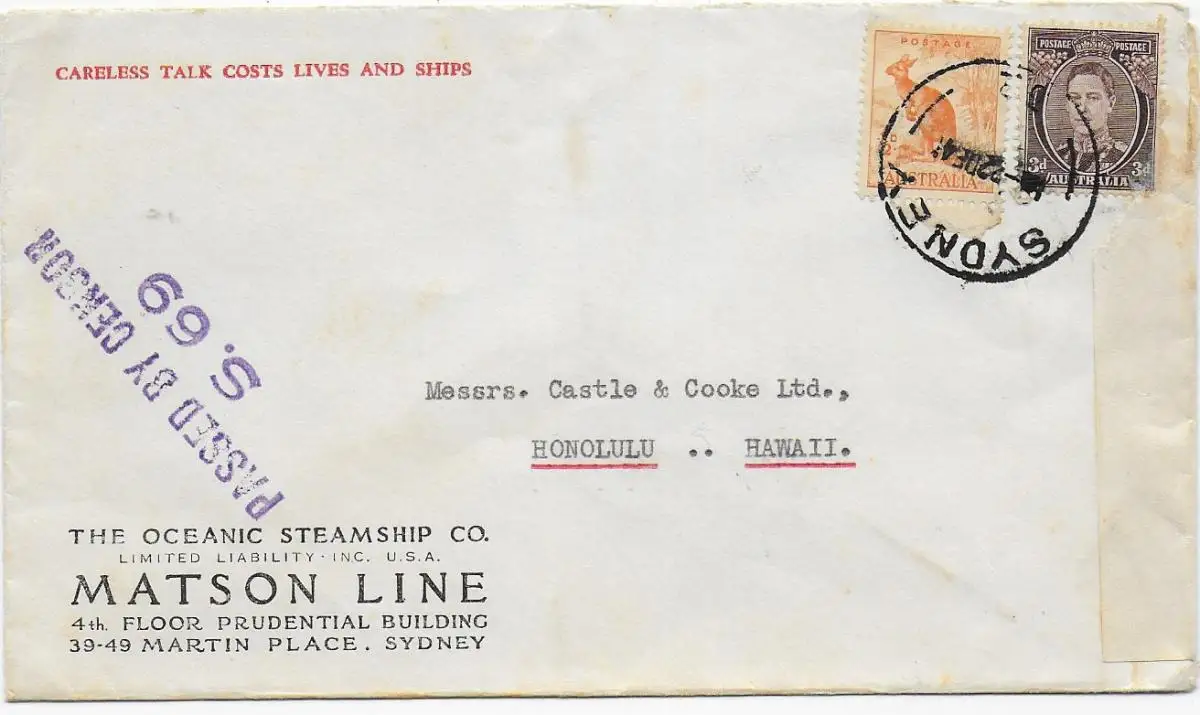 Sydney to Honolulu/Hawaii, 1941, 2x censorship: US and Australia