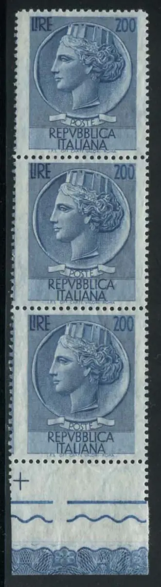 Syrakus Lire 200 Sorten linke vertikale Verzahnung nach außen verschoben Vollgummi - Syrakus Lire 200 Nr. 826 vertikaler Streifen von drei Exemplaren b. von f. mit links nach außen verschobener vertikaler Verzahnung - breitere Briefmarken Code 489/7