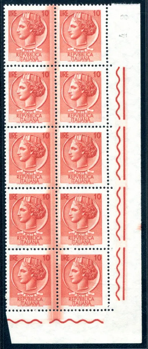 Syrakus Lire 10 (arabisch) Sorte chirurgischer Schnitt Vollgummi - Syrakus Lire 10 Nr. 1070 (arabisch) Block von zehn a. di f. mit auffälligem vertikalem chirurgischem Schnitt auf fünf Exemplaren - Selten so offensichtlich Cod. 719/13