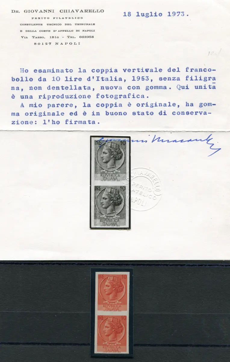 Syrakus Lire 10 Paar Sorten ohne Wasserzeichen ungezähnt Vollgummi MNH - Syrakus Lire 10 Nr. 764 vertikales Paar gedruckt auf Papier ohne Wasserzeichen, ungezähnt (Kat. Manelli, Pergolesi Nr. 2/II) - Cert. CH - Bewertung Kat. Manelli 1.400 - Gebraucht Cod. 457/15