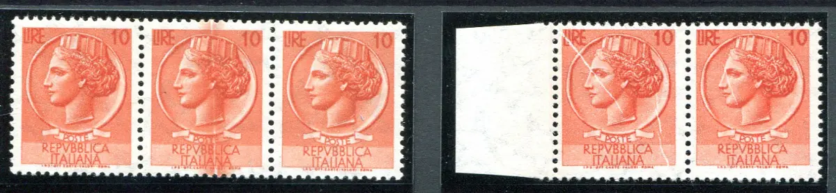 Syracusana Lire 10 Streifen Sorte Chirurgischer Schnitt Vollgummi - Syracusana Lire 10 Nr. 764 Dreierstreifen mit auffälligem chirurgischem Schnitt im Exemplar in der Mitte + ein Paar mit feinen Papierfalten beim Drucken Cod. 598/13