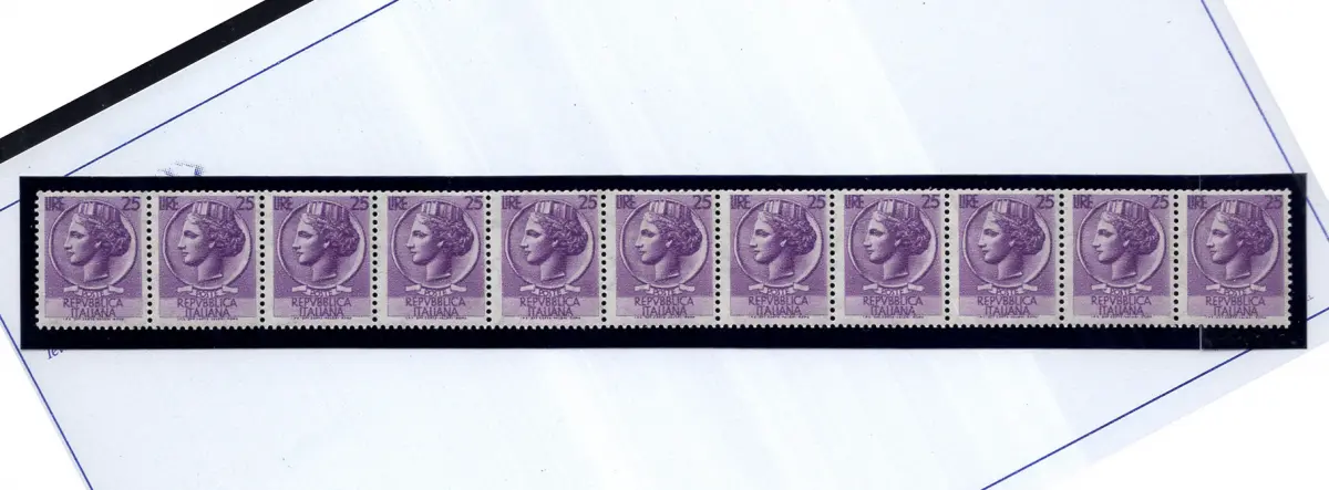 MNH - Vollgummi - Syrakus Lire 25 Nr. BS 769/I Streifen von elf Exemplaren mit filigranen Sternen II. Liegetyp, (Ausgabe für Verteilerautomaten) - neu einwandfrei mit Vollgummi - Ungewöhnlich - Kat. euro 192 Cod. 3613/WEB