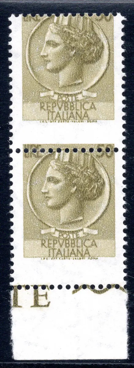 Syracusana Lire 50 (Vinyl) verschobene Verzahnung Sorte Vollgummi - Syracusana Lire 50 Nr. 1076l (Vinylkautschuk) Vertikaldrehmoment b. von f. mit stark nach unten verschobener Horizontalverzahnung - Kat. euro 180 Cod. 733/13