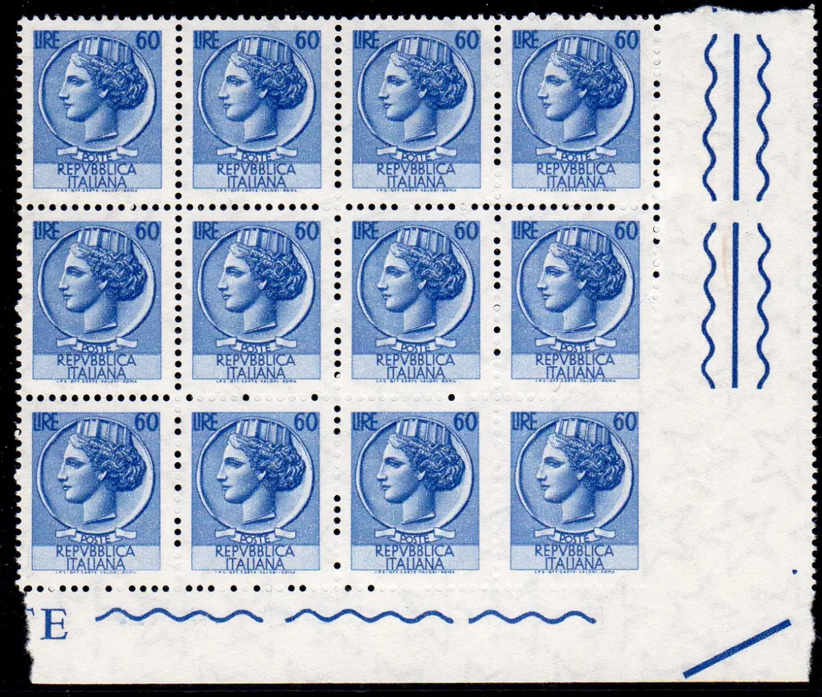 Syracusana Lire 60 Sortenblock Zahnfehler Vollgummi MNH - Syracusana Lire 60 Nr. 1078ha Zwölfblock a. von f. mit Lochfehler, im unteren Viertel so sehr, dass die Exemplare größtenteils blind gezahnt sind, eines auch rechts ungezähnt - natürliche Papierfalte auf einem Exemplar (Pos. 8 des Blocks) - Auffällige Cod. 529/15