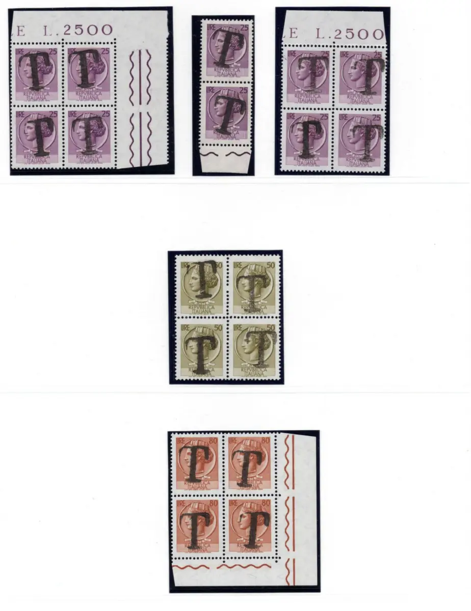 Syrakus Notfallsteuermarken - Sieben verschiedene Werte der Serie Vollgummi - Syrakus Notfallsteuermarken - Sieben verschiedene Werte der Serie von 5 Lire bis 80 Lire in Paaren oder Achtblöcken (insgesamt 36 Exemplare) alle handgestempelt mit dem großen T, so dass sie als Notfallsteuermarken verwendet werden können - Alle Briefmarken sind neu mit Gummi - Selten zusammen in diesem Zustand Cod. 715/13