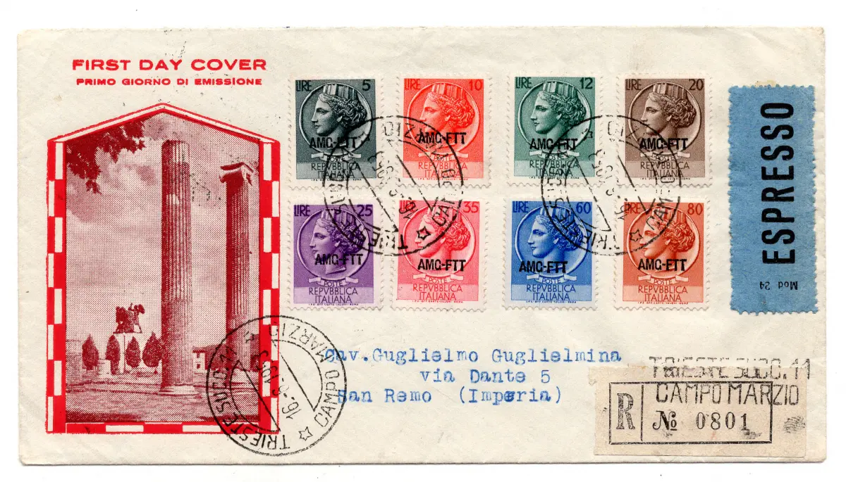 Umschlag - Syrakus Rad, die Serie von acht Werten ausgegeben am 16.6.53 auf figürlichem Umschlag FDC gereist Racc. expresso da Trieste Succ. 11 Campo Marzio nach San Remo - Sehr schön und ungewöhnlich Cod. 1030/17