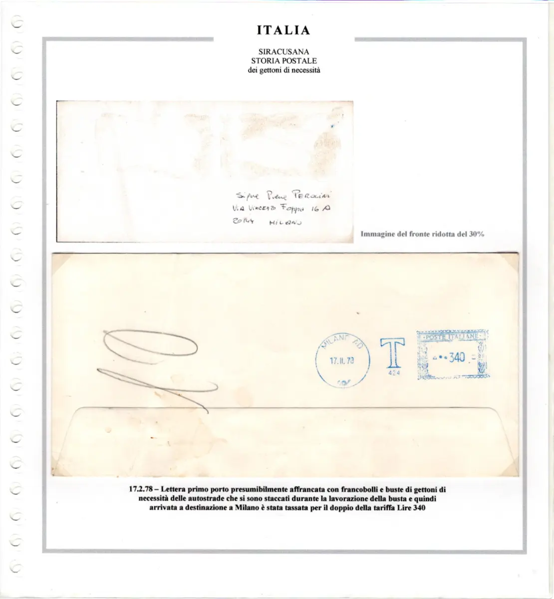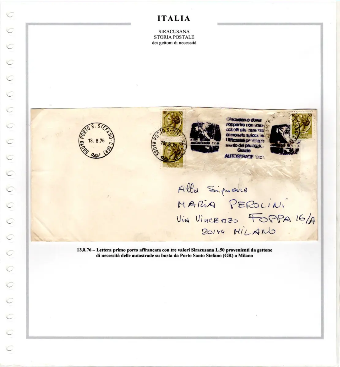 Umschlag - Sammlung auf Marini-Blättern montiert - Enthält 3 verschiedene Bedarfsmarken der italienischen Autobahnen und 7 posthistorische Dokumente, alle frankiert mit Werten der Syrakus-Serie - Seltenes Set für Spezialisten der Serie Cod. 4010 / WEB