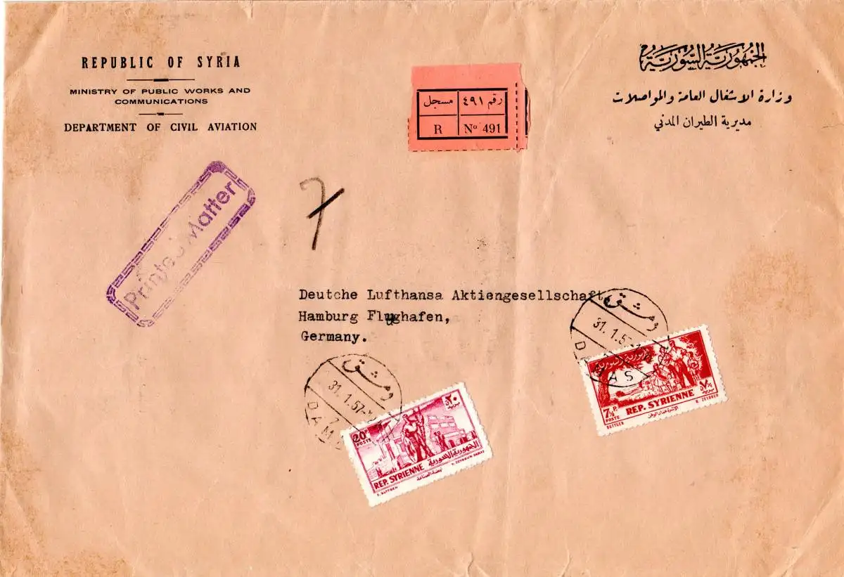 Syrien 1957, 7 1/2+20 P. auf Einschreiben Drucksache Brief v. Damas n. Hamburg