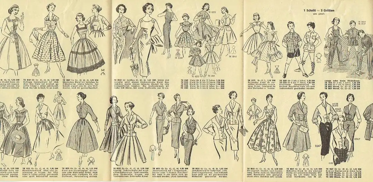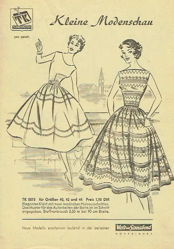 guter Zustand, geringe Gebrauchs- und Alterungsspuren: Papier etwas vergilbt, aber Seiten sauber und ordentlich - teils leicht knittrig, Prospekt damals erhältlicher Schnittmusterbogen, Softcover, ca. 15 x 21, 8 Seiten mit zahlreichen Bildern